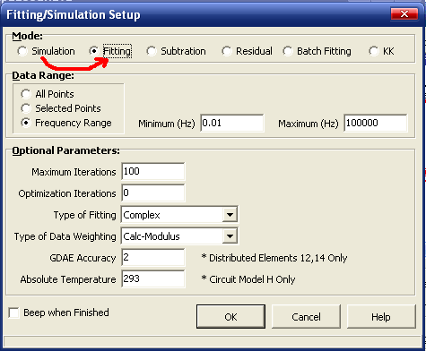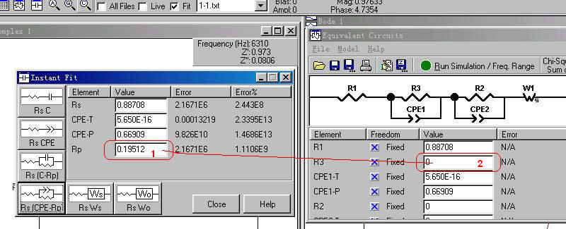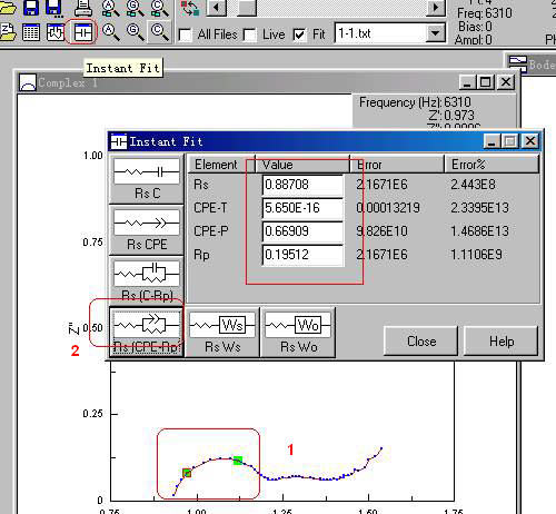 1.7把圖1-9中的“1”處的Fixed改成Free,為擬合作準(zhǔn)備,同時(shí)需要將等效電路擬合窗口(如圖1-10)中的mode由“Simulation 改選為“Fitting”才能擬合。