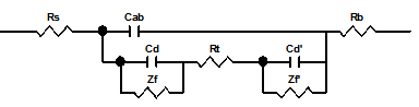 圖中AB分別表示電解池的研究電極和輔助電極兩端,Ra, Rb分別表示電極材料本身的電阻,Cab表示研究電極與輔助電極之間的電容,Cd與Cd’表示研究電極和輔助電極的雙電層電容,Zf與Zf’表示研究電極與輔助電極的交流阻抗。通常稱為電解阻抗或法拉第阻抗,其數(shù)值取決于電極動(dòng)力學(xué)參數(shù)及測量信號的頻率,Rs表示輔助電極與工作電極之間的溶液電阻。一般將雙電層電容Cd與法拉第阻抗的并聯(lián)稱為界面阻抗Z。