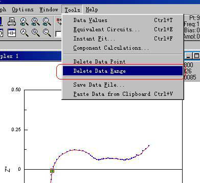 1.3 刪除不需要的數(shù)據(jù),通過光標(biāo)選擇不需要的數(shù)據(jù)段,也就是Zview不能擬合的部分,然后用菜單Tools→“Delete Data Range”刪除之。