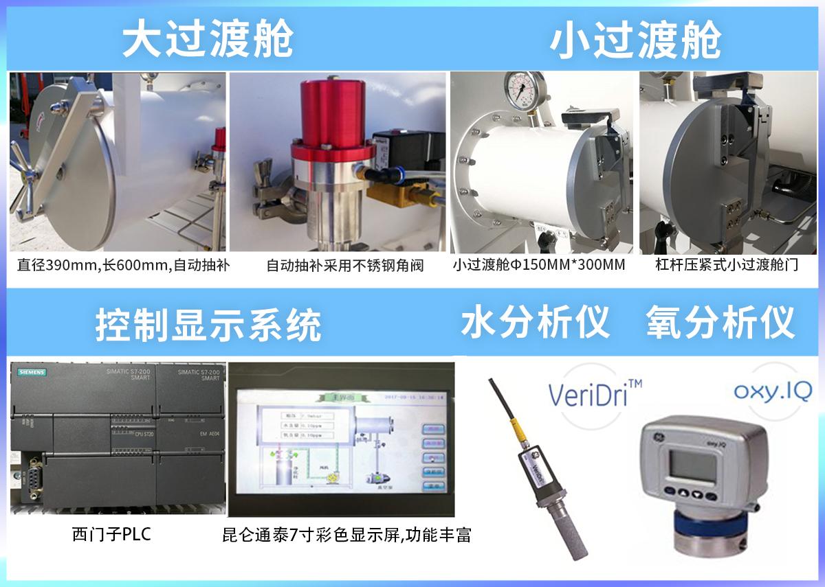 大過渡艙手動開閉,具有自動抽氣補(bǔ)氣功能,通過觸摸屏控制。 小過渡艙手動開閉,三通球閥手動操作抽氣補(bǔ)氣 |